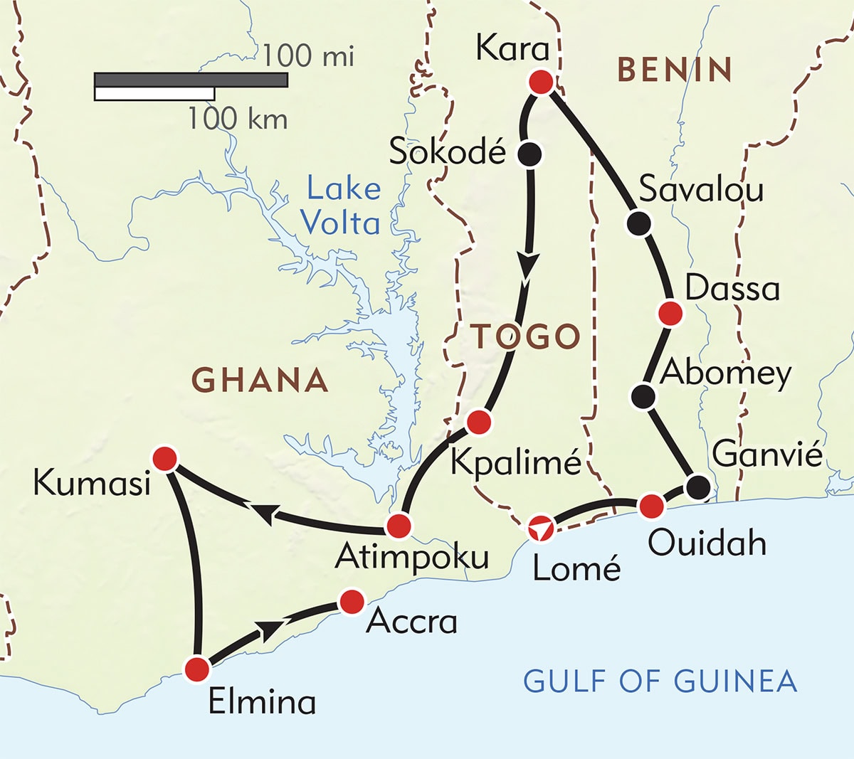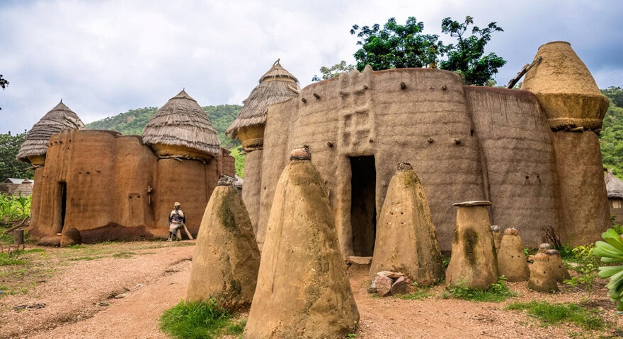 After meeting with a tribal king who rules the Anii people, we cross into Togo. In a baobab-dotted landscape that rarely sees outsiders, we call at isolated Tamberma villages in the Kara region, known for their fortified adobe castles, attend a fire dance, and visit bead artisans in the Volta region of Ghana.