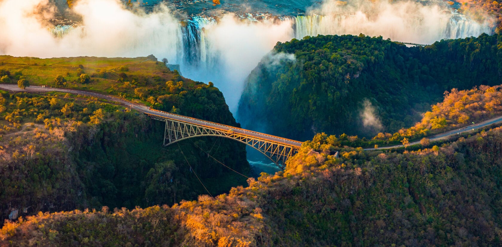 Victoria Falls, or Mosi-oa-Tunya, “the smoke that thunders,” is one of Africa's most famous sights. Here the mile-wide Zambezi River drops 300 feet into a sheer chasm to create a spectacular thundering cascade. Above the falls, the river is placid, with palm-fringed islands and rainforested banks. In 1860, Scottish missionary and explorer David Livingstone was the first Westerner to report the existence of this mile-wide cascade, and he named this magnificent wonder for his queen. Since then, it has attracted visitors from around the world. The Zambezi River marks the border between Zambia and Zimbabwe, and visitors can walk across a bridge to view the falls from both countries.