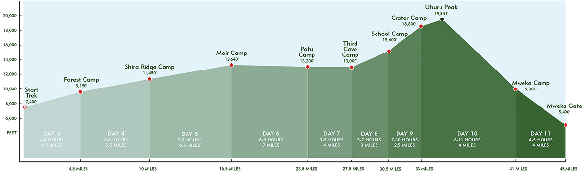 The Shira Route begins in the West, starting higher up the mountain than even Lemosho. Climbers drive from Arusha (4,593 feet) for approximately 5 hours and don’t begin hiking until they get to Shira Gate, which is at 11,800 feet! Driving to the plateau is too fast in one day and climbers can expect to have a hard time adjusting to the altitude. The route ends at Barafu with the challenging summit day of a 4,000 foot ascent followed by a 9,000 foot descent via Mweka.