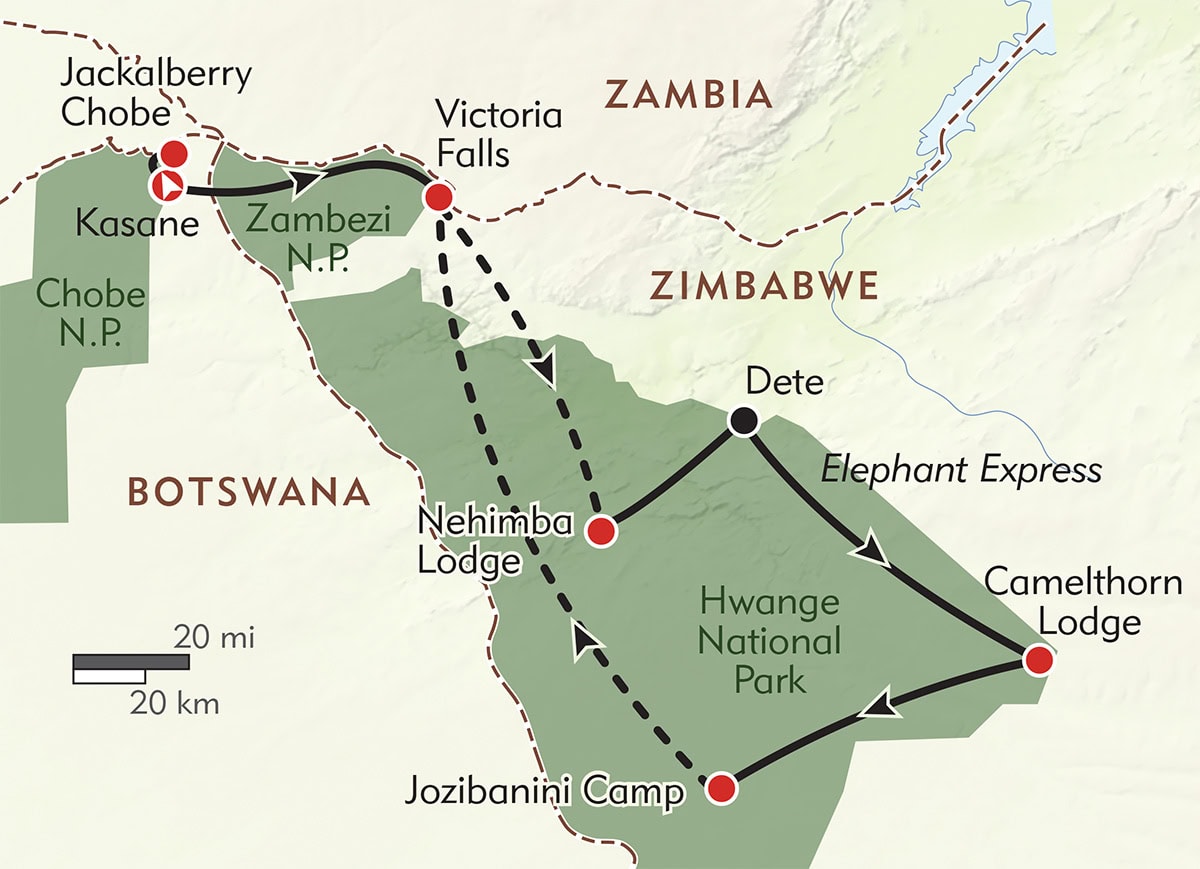 Imagine exploring the utterly remote game lands linking Botswana's renowned Chobe National Park with the famed elephant stronghold of Hwange National Park in Zimbabwe—some 45,000 elephants roam this wild trans-frontier corridor. We'll head across rich savannas unknown to most travelers, encountering massive herds of elephants and plenty of other wildlife including lion, rare sable antelope, African painted dog, wildebeest, buffalo, giraffe, and more. Our unique and wonderfully located lodges bring all the comforts, and in Hwange, we'll visit the new sanctuary for white rhinos, a community-owned conservation success.