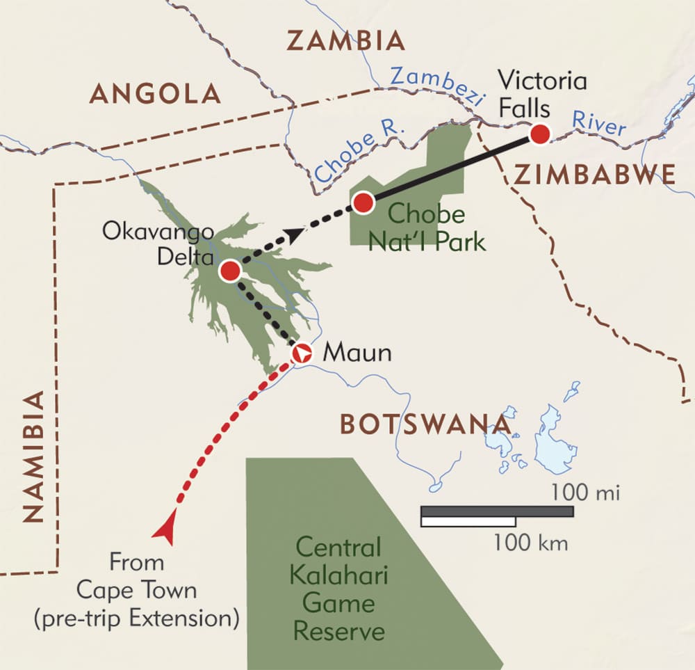 On this Private Journey, head to the renowned safari paradise of Botswana to explore its preeminent habitats, from the game-rich floodplains of the Okavango Delta to the wildlife paradise of Chobe National Park, one of Africa's legendary game reserves. Enjoy world-class wildlife viewing, including game tracking by open vehicle, safaris by riverboat and mokoro (dugout canoe), and exciting game walks. Small, intimate safari camps right in the heart of game country are your delightful accommodations. This journey also includes the world-famous natural wonder of Victoria Falls, and optional extensions to beautiful Cape Town and Johannesburg.