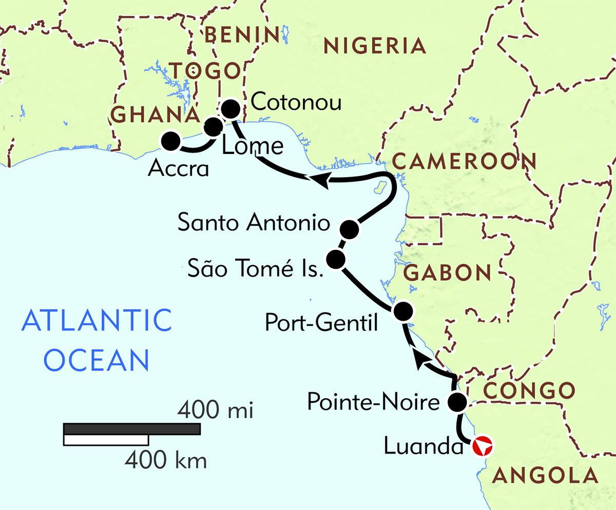 Experience the myriad cultures and fascinating wildlife reserves of Africa's West Coast. Call at Gabon to explore the beautiful beaches and rich culture of Port-Gentil; visit picturesque São Tomé, capital of São Tomé and Principe. In Benin, explore the stilt village of Ganvié and traditional villages on Lake Togo, then head to Accra, Ghana, to disembark.