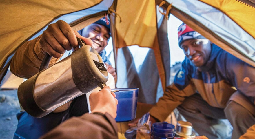 On the Kilimanjaro climb, porters carry the group gear and you carry a daypack for your wind/rain jacket, water bottle, and camera (depending on your equipment, this can weigh approximately 10 pounds). The camp crew sets up camp each day and we are served dinner in a dining tent with tables and chairs. We use American-made mountaineering tents rated by the manufacturer as 3-person tents but we use them for only two people, ensuring a fair amount of space for sleeping. Sleeping bags are rated to -30°F and sleeping pads are two inches thick and over two feet wide. Fires are not allowed on the mountain so there are no hot showers available at camps (hot showers are available at all of our safari camps).