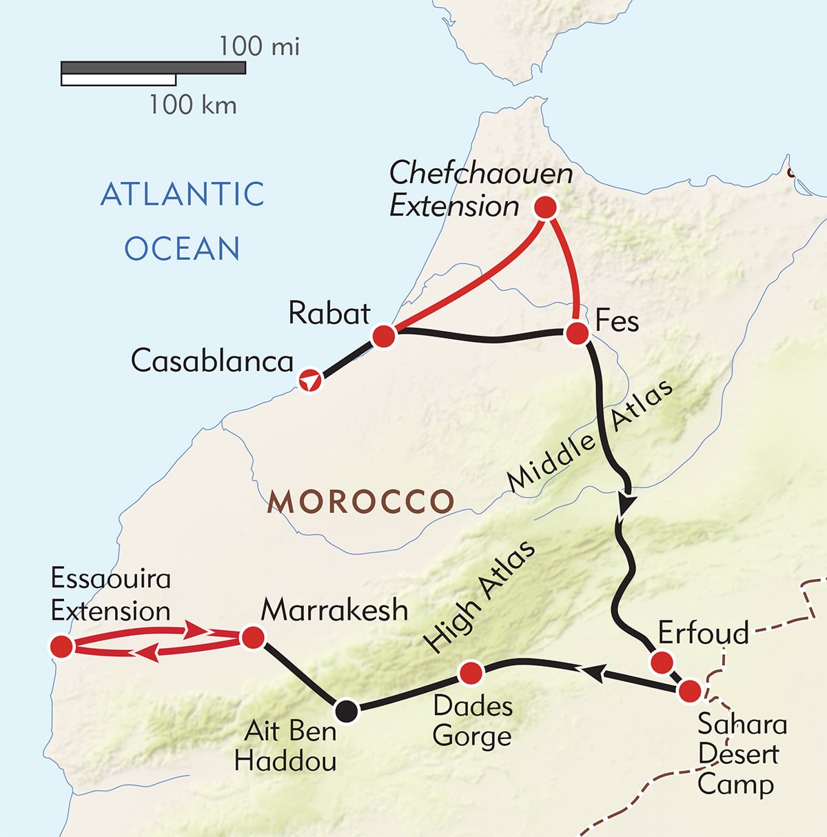 Morocco's sensuous beauty is legendary, from imperial cities with labyrinthine souks to the awesome grandeur of the Sahara. Our Private Journey discovers this graceful land in Fes—a walled city suspended in a medieval dream—and in the storied casbahs of Marrakesh, in the red-rock canyons of the High Atlas, and in a stunning desert oasis where dunes stretch to the horizon. You have a private guide with you from Day 1 through the afternoon of Day 8, and your accommodations are in hotels as well as riads, traditional mansions that have been converted into boutique hotels of character, with charming Moorish and Andalusian architecture, tiled central courtyards open to the sky, and peaceful rooftop gardens. Each riad is unique and has its own special personality and decor. Extend your travels to the enchanting walled town of Essaouira on the edge of the sea, or explore the dramatic "blue city" of Chefchaouen.