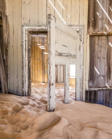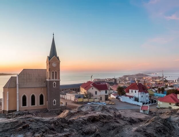 Now known as Moçâmedes, the port of Namibe was settled by the Portuguese in the 19th century. This early slave trading town is the entrance to the arid Namib desert, with towering sand dunes and home to the ancient welwitschia mirabilis trees, each over 2,000 years old and threatened by climate change. Near the port, the old town has colorful colonial architecture, beaches, and historic buildings, including an abandoned spaceship-like cinema. The following day is at sea.