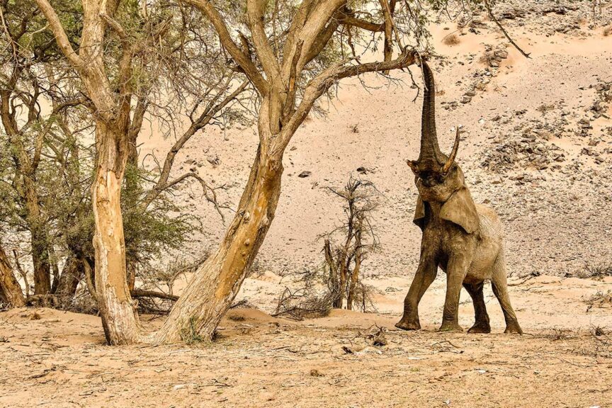 Onduli Ridge, our home in Damaraland, is named after the resident giraffe of the area, and we spent our days here looking not only for giraffe, but other desert adapted wildlife such as rhino and elephant. A drive down the Aba Huab riverbed will almost always reveal a herd of elephant. The herd is usually flanked by two males, so when we came across this fella having a snack of seeds pods from an ana tree, we knew we’d find the rest of the herd behind him.