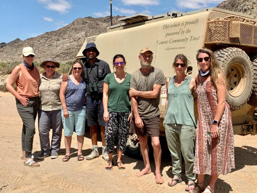 We continued west through the Hoarusib River to the ends of the earth, Namibia’s Skeleton Coast. This drive was extra special, as Dr. Stander was escorting a pride of lions west and away from human settlements, and could never have guessed our “group of beautiful women” would surprise him at his office in the middle of nowhere. After a brief chat, we let him get back to work and continued our journey west through the riverbed as it twisted and turned through steep canyon walls of black and red volcanic rock before gradually being replaced with the towering dunes of the Skeleton Coast.