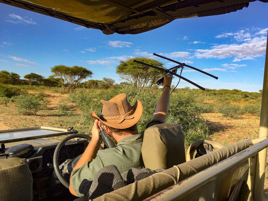 VHF tracking involves using a directional antenna to follow the signal given off by a transmitter affixed to a leopard. The guide rotates the antenna until the loudest signal is found, following the signal and checking it frequently until the leopard is hopefully located. Sitting quietly, honing your senses, and attuning them to the sounds of the bush and the radio signal is part of the thrill of tracking.
