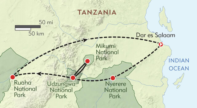 The truly wild side of Tanzania is in its remote southern reaches in legendary wildlife reserves including Ruaha National Park and the great Selous (now called Nyerere National Park). These reserves stretch for thousands of square miles, are relatively undisturbed by human activity, and host a fraction of the travelers who visit the northern parks! We’ll set off for exciting game drives, off-road tracking, bush walks, river safaris, and even a rainforest hike, plus explorations in Mikumi National Park, with its plains game and wild dogs, and the lush ecosystem of Udzungwa Mountains National Park. Our comfortable and well-located safari camps extend a warm welcome.