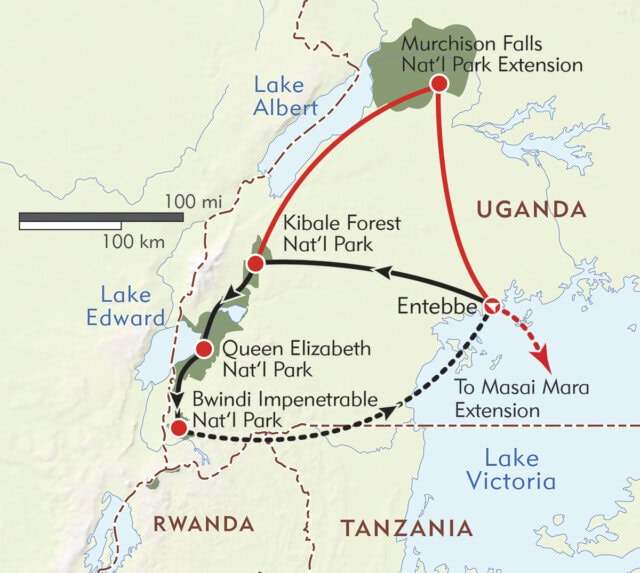 Bwindi Impenetrable National Park is home to more than 400 mountain gorillas. We head out with our ranger guides for two full days of tracking. The hikes are challenging but the rigors are soon forgotten as we come face to face with a gorilla family in the wild. We’ll enjoy a private tour at Conservation Through Public Health (CTPH), learning about this award-winning NGO’s work in conservation and local community health, and we’ll dine with one of the CTPH doctors. Depart in the evening of Day 10 via Entebbe or join our Masai Mara National Reserve Extension.