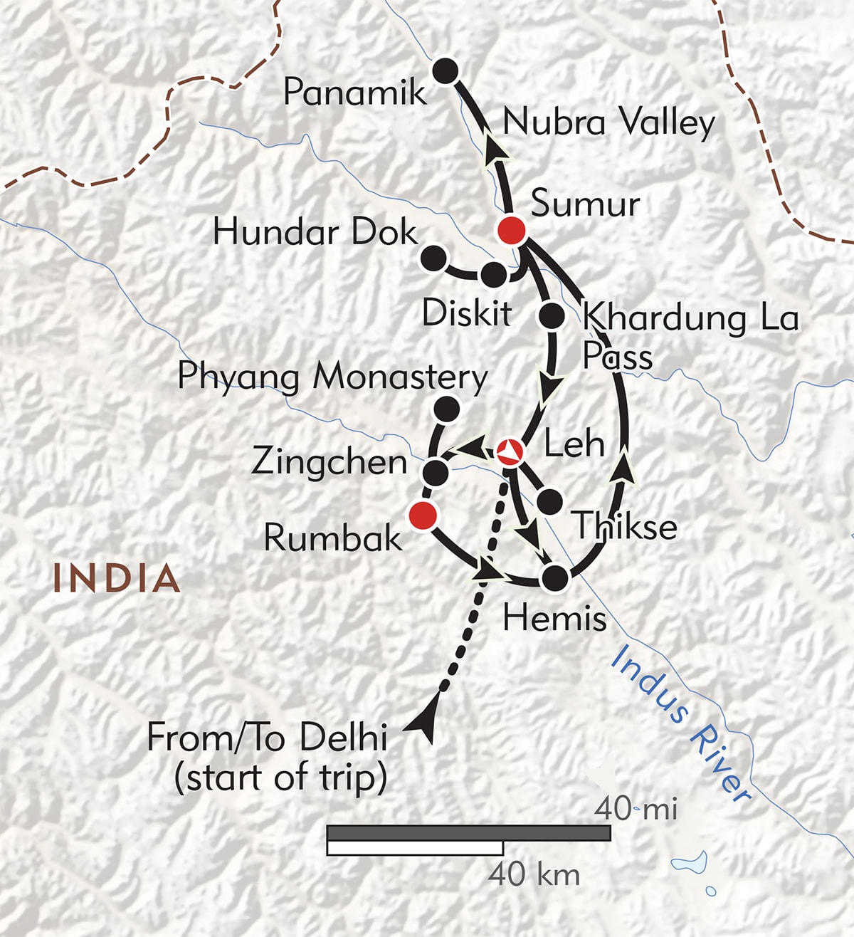 Fly to Leh, a former trans-Himalayan trading post set at 11,500 feet in the upper Indus Valley. Witness a prayer ceremony at Thikse Monastery, explore the lanes of upper Leh, watch sunset from Shanti Stupa, and visit 17th century Hemis Monastery, with a hike up to the cave-hermitage of Gotsang.