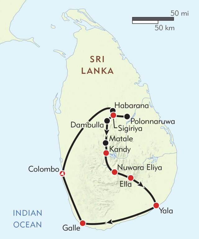 After a visit to Colombo’s markets and mix of Hindu and Buddhist temples, we head to our lovely resort hotel overlooking the rock fortress of Sigiriya. Here we’ll look for wild elephants in Kaudulla National Park, then visit the graceful pagodas of 10th century Polonnaruwa (Sri Lanka’s lovely medieval capital) and King Kashyapa’s citadel of Sigiriya, a towering rock outcrop rising from the jungle plains. Both places are World Heritage Sites. Near Ritigala, we visit a local school, then head to a Buddhist monastery to participate in an almsgiving ceremony.