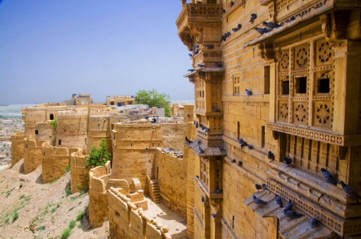 The origins of Jaisalmer go back to the 12th century when Rawal Jaisal, a Rajput chieftain of the Yadav clan, abandoned his old fort at Lodurva and laid the foundation of a new city on a triple-peaked rock. The Golden Fort and its inner citadel crown the 80-meter-high hill and are approached through the Sun Gate. Within the fort is a seven-story palace with its Megh Durbar, or Hall of Clouds. Also in the inner enclosure is a group of finely carved Jain temples that date from the 12th to the 15th centuries. The glory of Jaisalmer faded when sea trade replaced the old land routes, but an “Arabian Nights” quality remains in Jaisalmer's streets and marketplaces. The narrow streets of the walled city preserve a traditional way of life as craftsmen still work in ancient arts, including stone carving and silver jewelry.