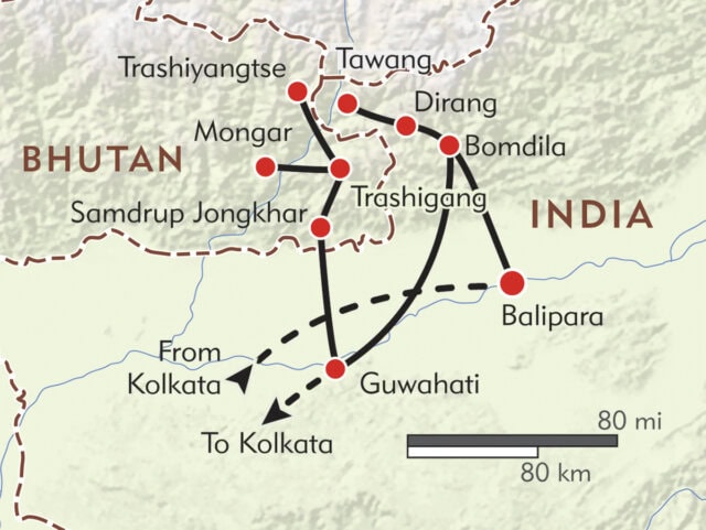 In Bomdila, we visit the Gentse Gaden Rabgyel Ling Monastery, whose temple of Buddha attracts pilgrims in great numbers. After an overnight in Guwahati, we cross the border and enter Bhutan, with overnights in the ancient town of Trashigang, once a bustling trade center with Tibet. Today it attracts the semi-nomadic Merak and Sakteng people, who come here to trade their yak butter for other goods. At the Mongar Dzong, we witness a traditional Tibetan Buddhist festival with spectacular masked dances.
