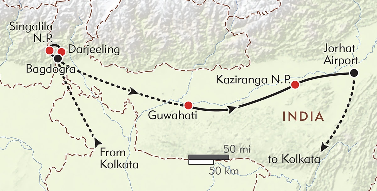 We descend from Singalila and continue to Darjeeling, long the queen of the British hill stations and still exuding Victorian charm. During our days here, we'll ride the narrow-gauge “toy train” and visit the Himalayan Mountaineering Institute and Himalayan Zoological Park, with the option of a sunrise visit to the famous Kanchenjunga viewpoint at Tiger Hill.