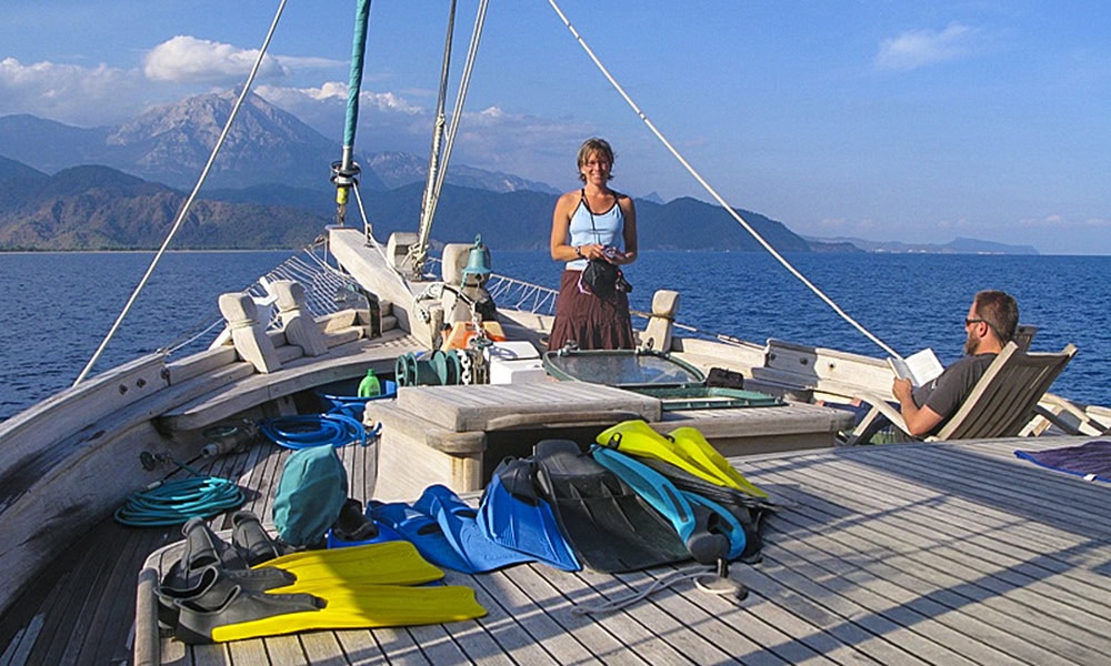 Being able to swim is important on any boating trip, and the warm waters make this an ideal trip for those who like to swim and snorkel. While there is some snorkeling equipment available on board, we cannot guarantee the quality and the fit of the equipment. We highly recommend bringing your own snorkel and mask to assure a proper fit. To get on and off the boat, there is a gradual 45-degree incline on the suspended sea ladder that allows easy access. The dinghy can take up to five guests at a time and has an outboard engine.